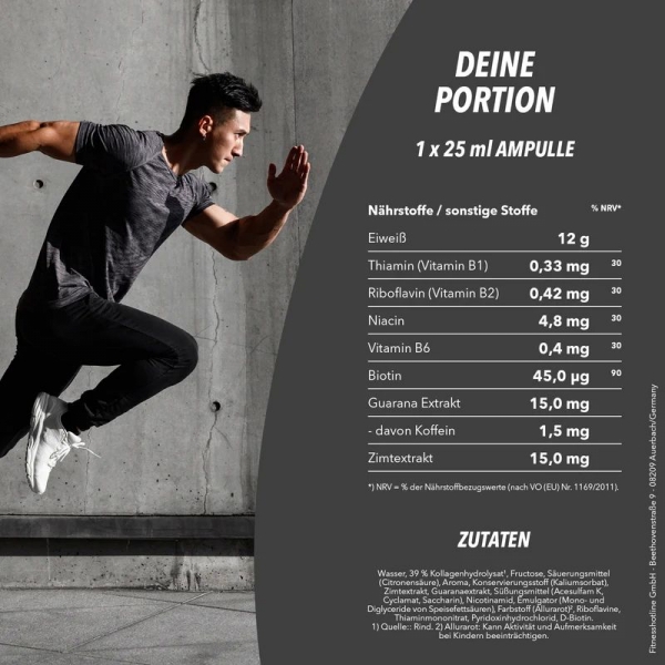 Wasser, 39 % Kollagenhydrolysat1, Fructose, Säuerungsmittel (Citronensäure), Aroma, Konservierungsstoff (Kaliumsorbat), Zimtextrakt und -blattextrakt, Guaranaextrakt, Süßungsmittel (Acesulfam K, Cyclamat, Saccharin), Niacin, Emulgator (Mono- und Diglyceride von Speisefettsäuren), Farbstoff (Allurarot)2, Riboflavine, Thiaminmononitrat, Pyridoxinhydrochlorid, Biotin.