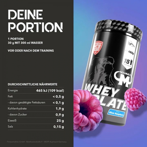 Eine abwechslungsreiche, ausgewogene Ernährung und eine gesunde Lebensweise sind wichtig für die Gesundheit. Hergestellt in Deutschland. Besonders für Sportler geeignet. Maximal 1 Portion pro Tag. Herkunft Primärzutat EU/Nicht-EU: Molkenproteinisolat.