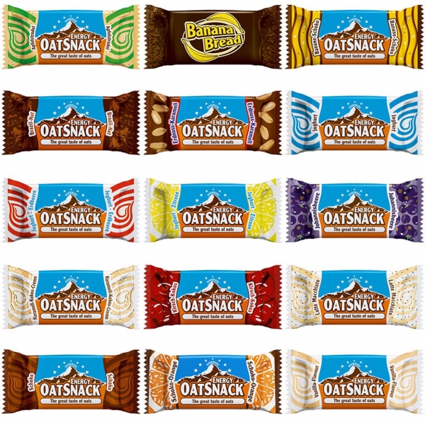Saftige Haferflocken bilden die Basis für den EnergyOatSnack, der je nach Geschmacksrichtung mit leckeren Zutaten wie Kirschen, Beeren, Nüssen, Kokosflocken oder Joghurt verfeinert ist.