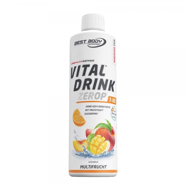 Mit dem Vital1 Drink ZEROP® von Best Body Nutrition kann in Sekundenschnelle ein kohlenhydratreduziertes, zuckerfreies4 Getränk hergestellt werden. Im Vergleich zu herkömmlichen Getränkekonzentraten weist er einen um durchschnittlich 98 % geringeren Kohlenhydratanteil auf. Für das besondere fruchtig-frische Geschmackserlebnis sorgt der enthaltene Fruchtsaft2.