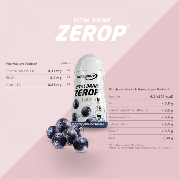 Mit dem Vital1 Drink ZEROP® Squeeze von Best Body Nutrition kann in Sekundenschnelle ein kohlenhydratreduziertes, zuckerfreies4 Getränk hergestellt werden. Im Vergleich zu herkömmlichen Getränkekonzentraten weist er einen um durchschnittlich 98 % geringeren Kohlenhydratanteil auf. Für das besondere fruchtig-frische Geschmackserlebnis sorgt der enthaltene Fruchtsaft2. Neben dem Fruchtsaft enthält der Vital1 Drink ZEROP® Squeeze die Vitamine B1, B6 und Niacin. Vitamine sind essentielle Nährstoffe. Diese kann der Körper selbst nicht herstellen, sie müssen ihm über die Nahrung oder Supplemente zur Verfügung gestellt werden. Die enthaltenen Vitamine B1, B6 und Niacin tragen unter anderem zu einer normalen Funktion des Nervensystems und zu einem normalen Energiestoffwechsel bei. Ein gut funktionierender Energiestoffwechsel ist wichtig für die Energiegewinnung, die wiederum für die Aufrechterhaltung der Grundfunktionen im Körper von großer Bedeutung ist. Zusätzlich tragen die Vitamine B6 und Niacin zur Verringerung von Müdigkeit und Ermüdung bei.