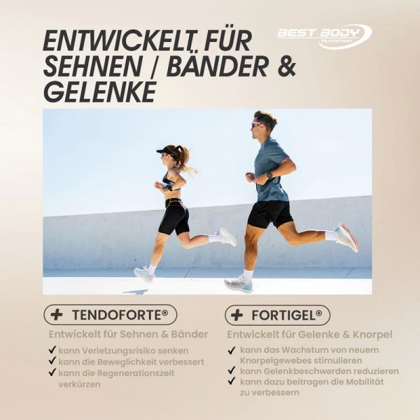 - Mit hochwertigen Kollagenpeptiden (FORTIGEL®, TENDOFORTE®, VERISOL®) für Haut, Knorpel und Knochen