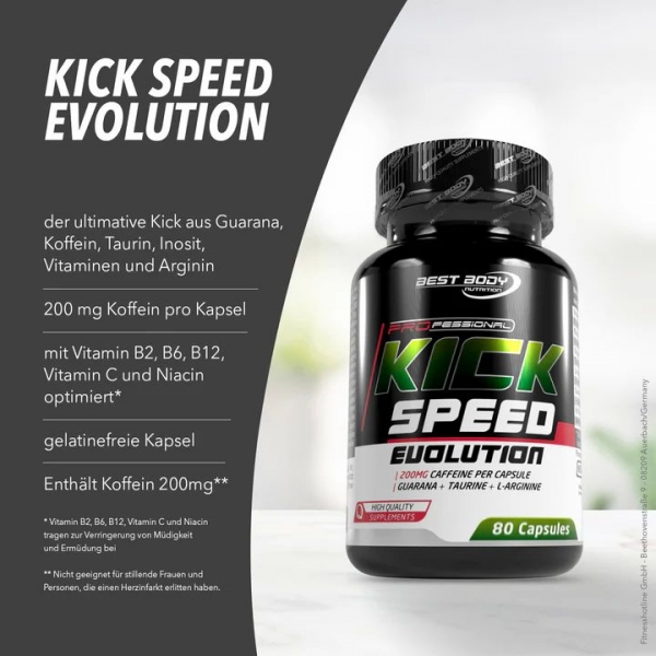 Best Body Nutrition Kick Speed Evolution Caps, Nahrungsergänzungsmittel mit Guarana, Taurin, L-Arginin, Inosit und Koffein. Enthält Koffein. Für Kinder und schwangere Frauen nicht empfohlen (200 mg pro Kapsel).