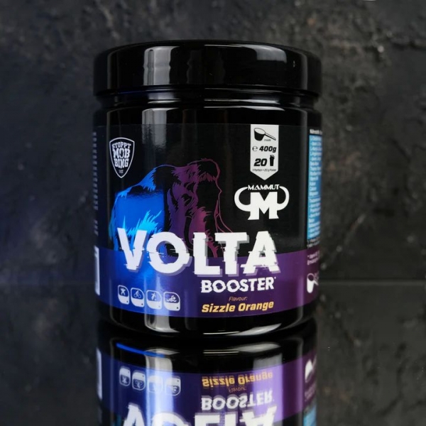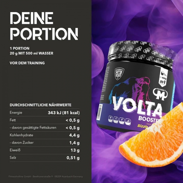 Mammut VOLTA PRE-WORKOUT BOOSTER, Nahrungsergänzungsmittel mit Aminosäuren, Kohlenhydraten, Vitaminen und Mineralstoffen. Mit Zucker und Süßungsmitteln. Mit Orangen Geschmack. Verzehrempfehlung: 1 Portion(20 g Pulver = 1 gestrichener Messlöffel) in 500 ml Wasser mixen.