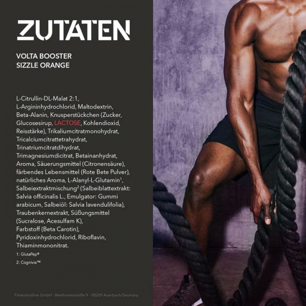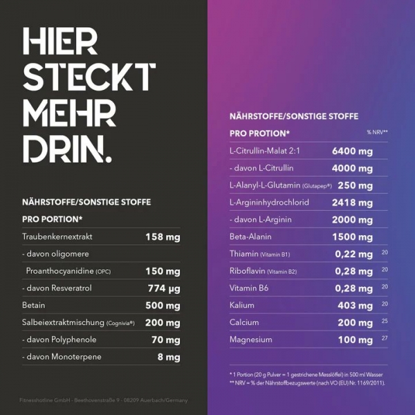 L-Citrullin-DL-Malat 2:1, L-Argininhydrochlorid, Maltodextrin, Beta-Alanin, Knusperstückchen (Zucker, Glucosesirup, Lactose, Kohlendioxid, Reisstärke), Trikaliumcitratmonohydrat, Tricalciumcitrattetrahydrat, Trinatriumcitratdihydrat, Trimagnesiumdicitrat, Betainanhydrat, Aroma, Säuerungsmittel (Citronensäure), färbendes Lebensmittel (Rote Bete Pulver), natürliches Aroma, L-Alanyl-L-Glutamin1, Salbeiextraktmischung2 (Salbeiblattextrakt: Salvia officinalis L., Emulgator: Gummi arabicum, Salbeiöl: Salvia lavendulifolia), Traubenkernextrakt, Süßungsmittel (Sucralose, Acesulfam K), Farbstoff (Beta Carotin), Pyridoxinhydrochlorid, Riboflavin, Thiaminmononitrat.
