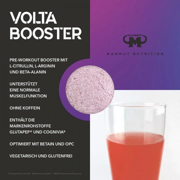 Um jedem Sportler die höchstmögliche Qualität zu bieten, ist der Mammut Volta Pre-Workout Booster mit den Markenrohstoffen Glutapep® und CogniviaTM optimiert. Das Glutapep® ist eine einzigartige Kombination zweier Aminosäuren. Das Dipeptid besteht aus der nicht-essentiellen Aminosäure L-Alanin und der semi-essentiellen Aminosäure L-Glutamin. Dipeptide sind kleiner als normale Proteine und gelangen deshalb direkter in die Muskelzellen, werden dadurch sehr effizient absorbiert und wirken schneller. CogniviaTM ist eine einzigartige Salbeiextraktmischung, welche sich aus Salbeiblattextrakt (Salvia officinalis L.) und Salbeiöl (Salvia lavendulifolia) zusammensetzt. Für mehr Informationen zu den beiden Rohstoffen verweisen wir auf die Herstellerseiten, welche in den untenstehenden Links* aufgeführt sind.