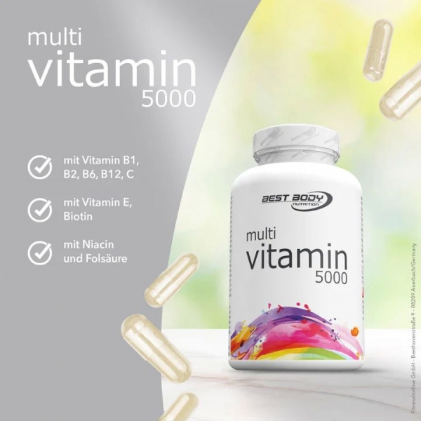 In den Multi Vitamin Kapseln von Best Body Nutrition sind 100 % der empfohlenen Tagesdosis an Vitamin B1, B2, B6, B12, C, E, Niacin, Folsäure und Biotin enthalten. Vitamine sind essentielle Nährstoffe. Diese kann der Körper selbst nicht herstellen, sie müssen ihm über die Nahrung oder Supplemente zur Verfügung gestellt werden.