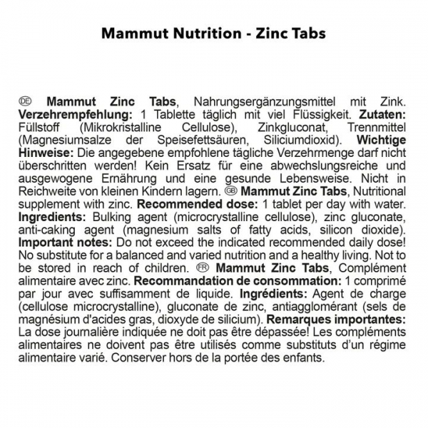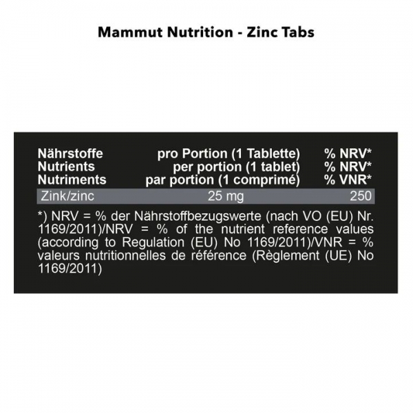 Die Mammut Zinc Tabs enthalten pro Tablette 25 mg Zink. Als Zinkverbindung wird das Zinkgluconat verwendet. Zinkgluconat ist eine organische Zinkverbindung. Zink selbst zählt zu den essentiellen Mineralstoffen. Sie sind für den Körper lebensnotwendige Nährstoffe, die den Körper über die Ernährung zur Verfügung gestellt werden müssen, da er sie selber nicht herstellen kann.