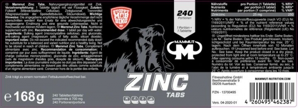 Mammut empfiehlt täglich 1 Zinc Tab zu einer beliebigen Hauptmahlzeit. Eine Dose enthält 240 Tabletten.